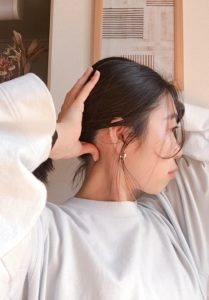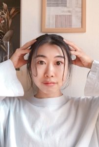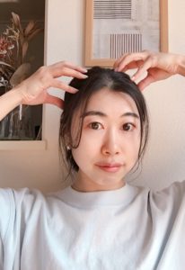 ①両手を耳上の側頭部において、髪の中に指を入れて