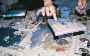 ポーリングアートとはどんなものかというと、絵の具をキャンバスに垂らして、キャンバスを傾けたりすることで模様を創っていくアートです!